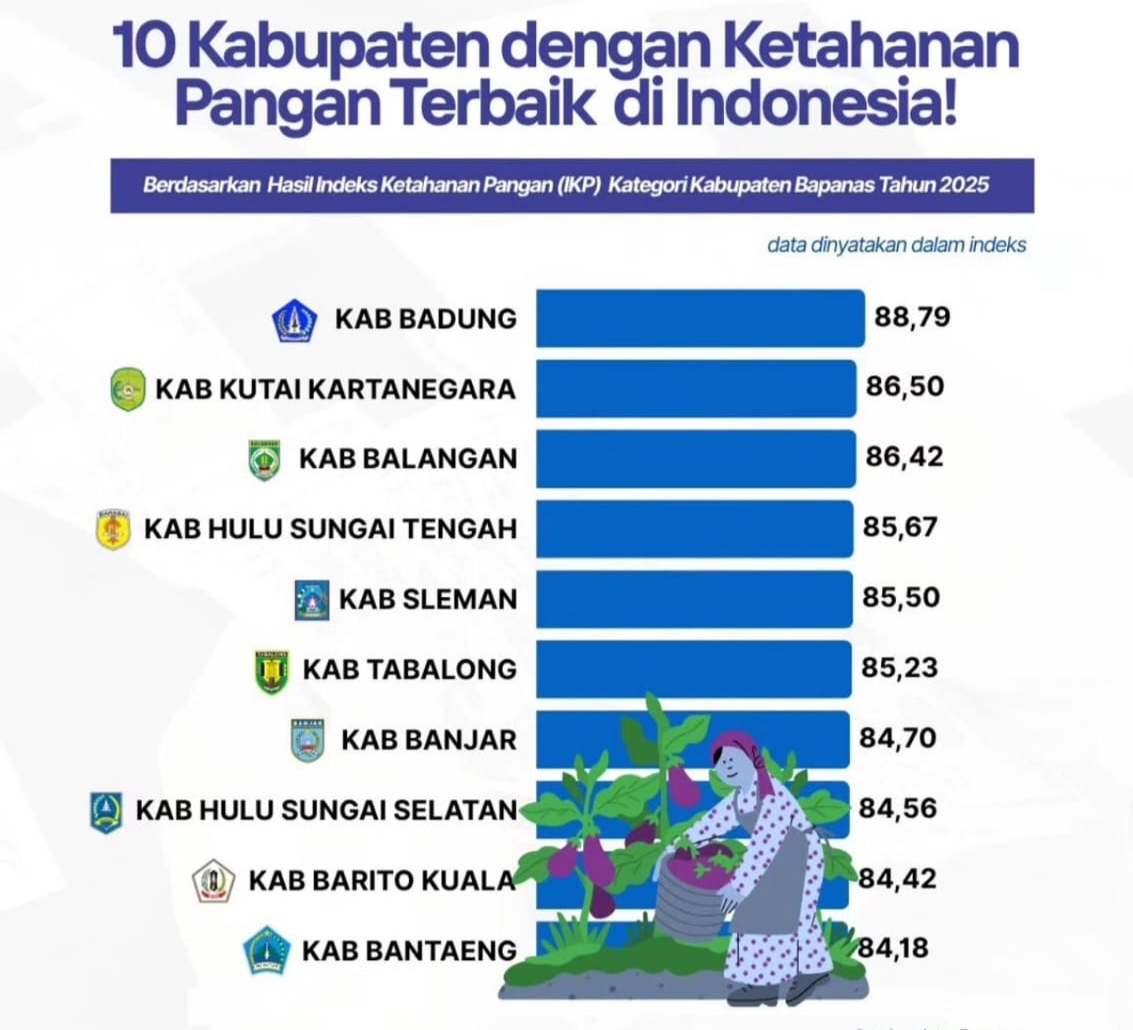 Capaian ini berdasarkan hasil Indeks Ketahanan Pangan (IKP) kategori kabupaten yang dirilis oleh Badan Pangan Nasional (Bapanas) pada 14 Maret 2026.